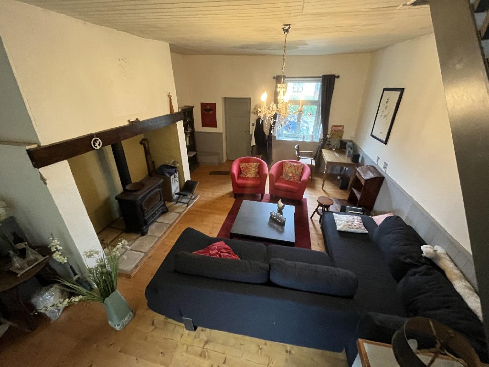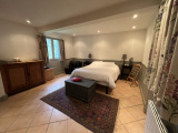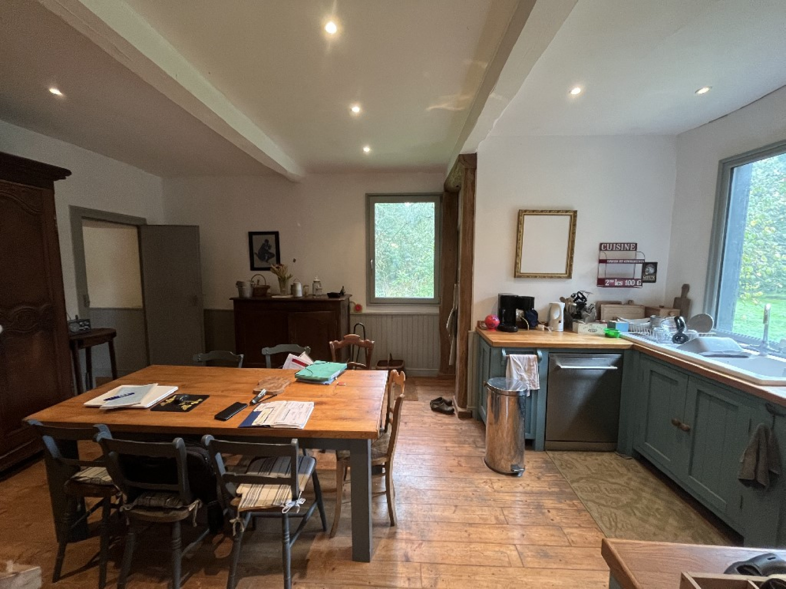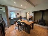 Au rdc : Salon avec poêle à bois (30m²), grande cuisine équipée ouvrant sur coin repas avec poêle à bois (26m²), 1 grande chambre (20m²), salle d'eau, wc.