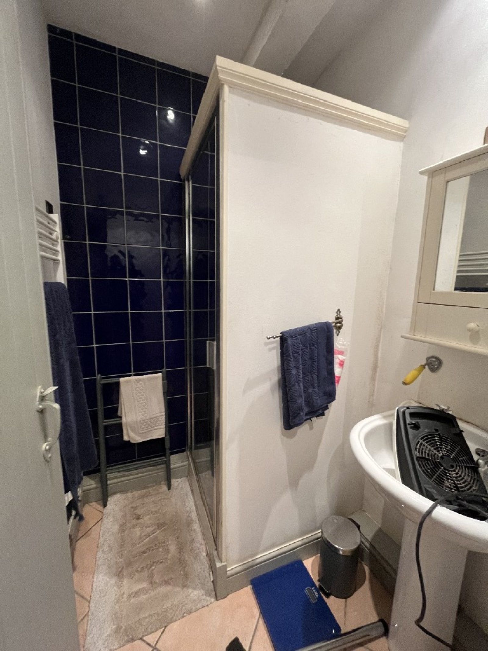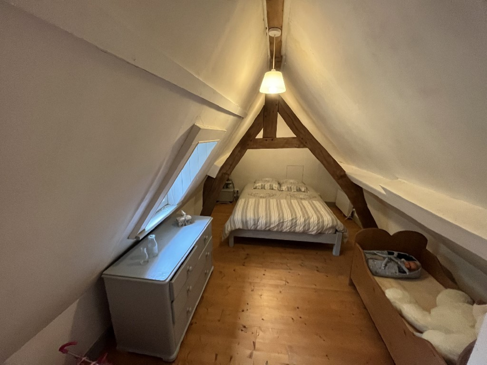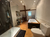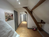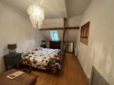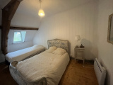 A l'étage: palier avec placards, 3 jolies chambres mansardées avec poutres apparentes et beau parquet, salle de bains spacieuse (baignoire, douche, toilette)
