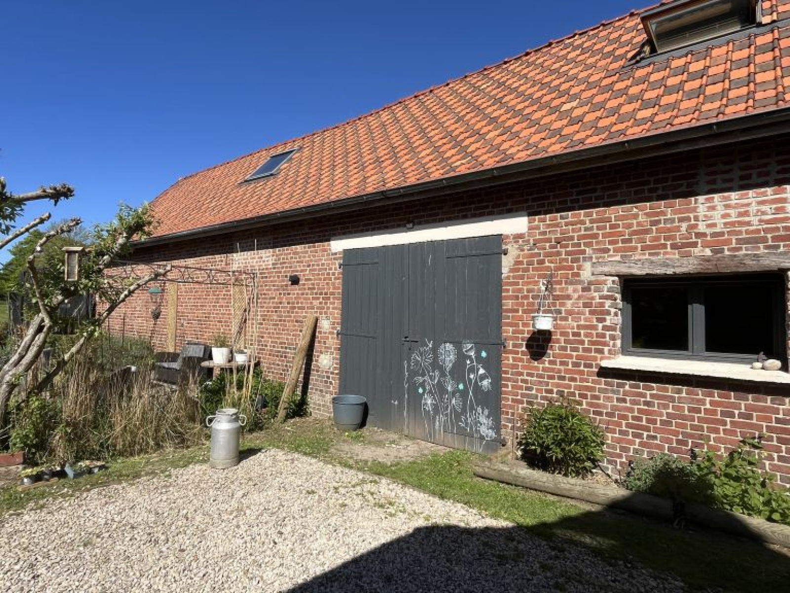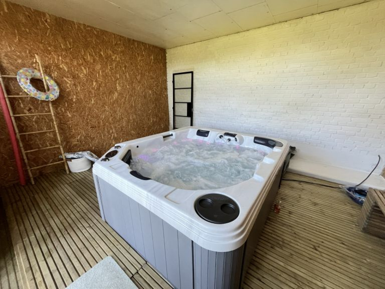 - Grange d’environ 100 m² avec dalle béton, dont une pièce aménagée avec SPA et vue sur le jardin