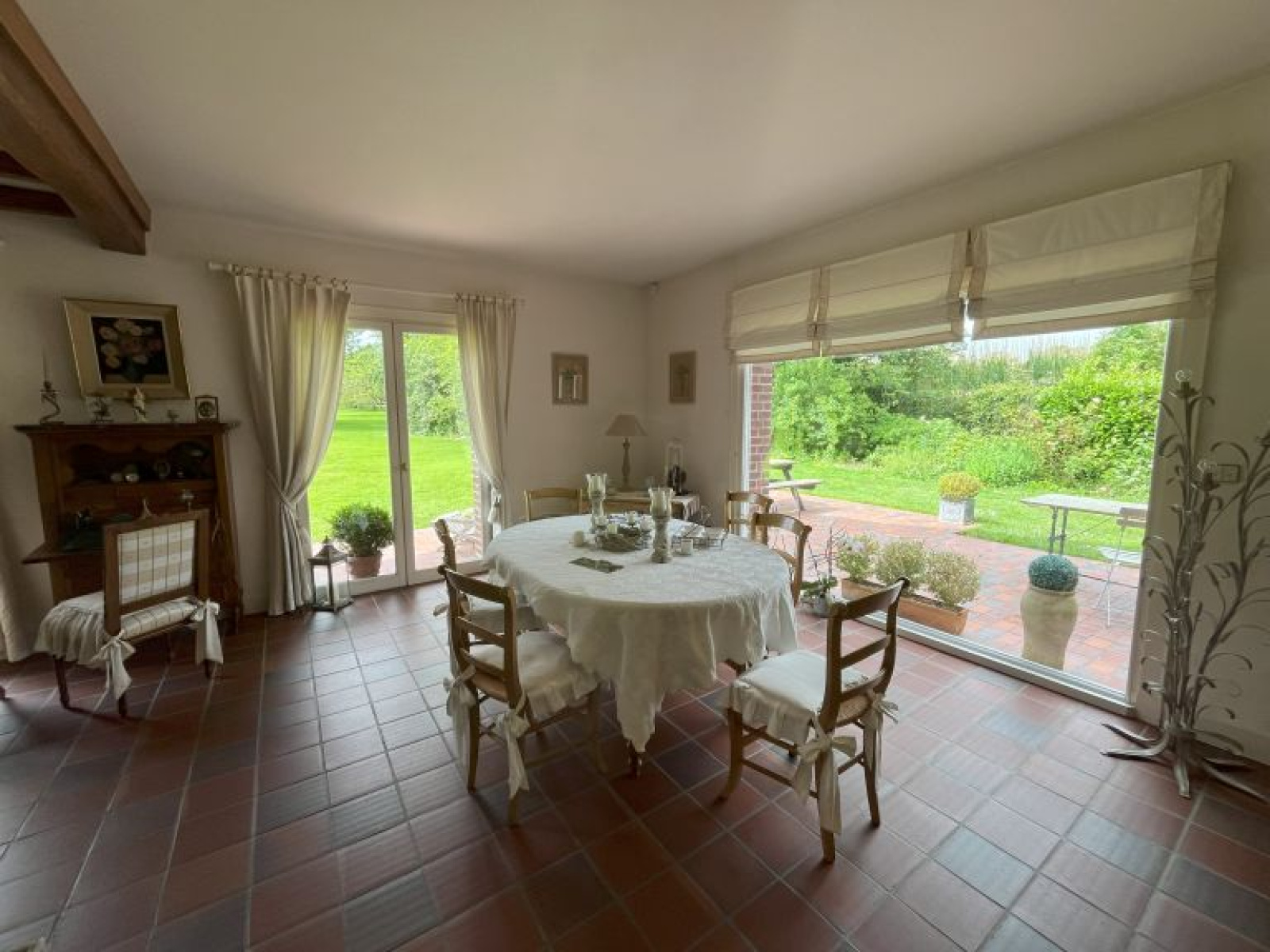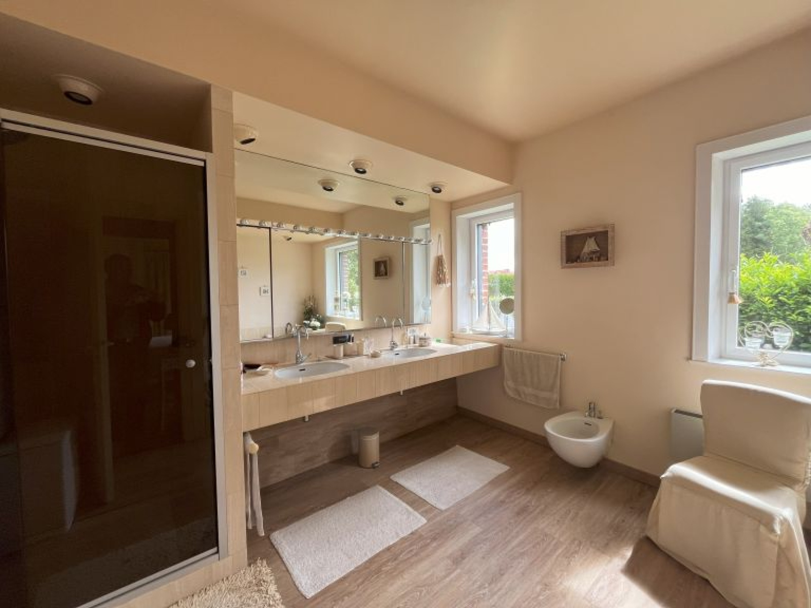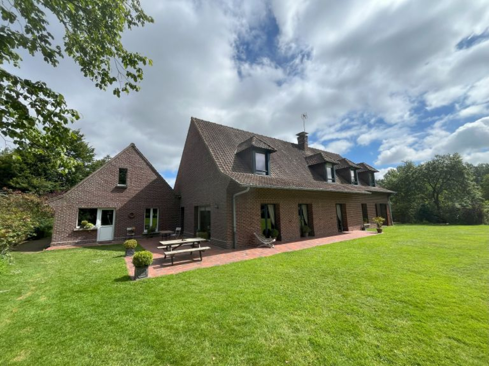 Ref 4436 : Superbe maison d’architecte de bon standing située dans un village de la vallée de la Canche entre Hesdin, Frévent et Saint Pol sur Ternoise. L’habitation comprend : Hall d’entrée, séjour double spacieux et lumineux (55m²) avec cheminée insert, grande cuisine équipée (15m²), arrière cuisine, grande suite parentale comprenant dressing, salle de bains (baignoire, douche, double vasque et placards), chambre avec porte fenêtre , bureau , wc, buanderie et laverie. A l’étage : palier desservant 3 belles chambres mansardées, rangements, salle de bains, wc, grand grenier aménageable (68m²). En sous sol : cave et chaufferie (60m²). Double garage (42m²) attenant a la maison , atelier. La propriété se situe en retrait de la route, sans vis-à-vis sur une parcelle paysagée de 5648m² . Double vitrage, pompe a chaleur eau/ eau , tout à l’égout.